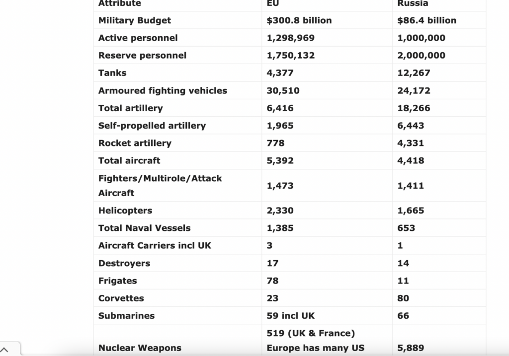 Η Ευρώπη πρέπει να είναι σε θέση να αμυνθεί ενάντια στη Ρωσία, με ή χωρίς τις Ηνωμένες Πολιτείες. Οι εκτιμήσεις δείχνουν ότι για να αποτρέψει τη Ρωσία, η Ευρώπη θα χρειαστεί 300.000 επιπλέον στρατεύματα και ετήσια αύξηση των αμυντικών δαπανών τουλάχιστον 260 δισεκατομμυρίων δολαρίων βραχυπρόθεσμα.
