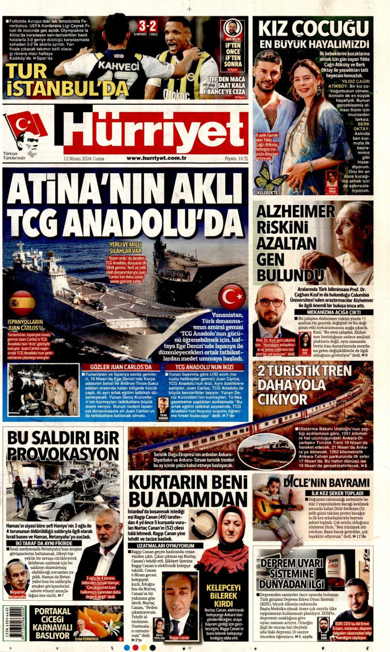 Στα πρωτοσέλιδα των εφημερίδων στην Τουρκία βρίσκεται ξανά η Ελλάδα με αφορμή την άσκηση που θα πραγματοποιηθεί στο Αιγαίο με τη ναυαρχίδα του ισπανικού στόλου πλοίο αμφίβιων επιχειρήσεων «Χουάν Κάρλος» με το δίδυμο πλοίο του τουρκικού μίνι αεροπλανοφόρου «Anadolu».