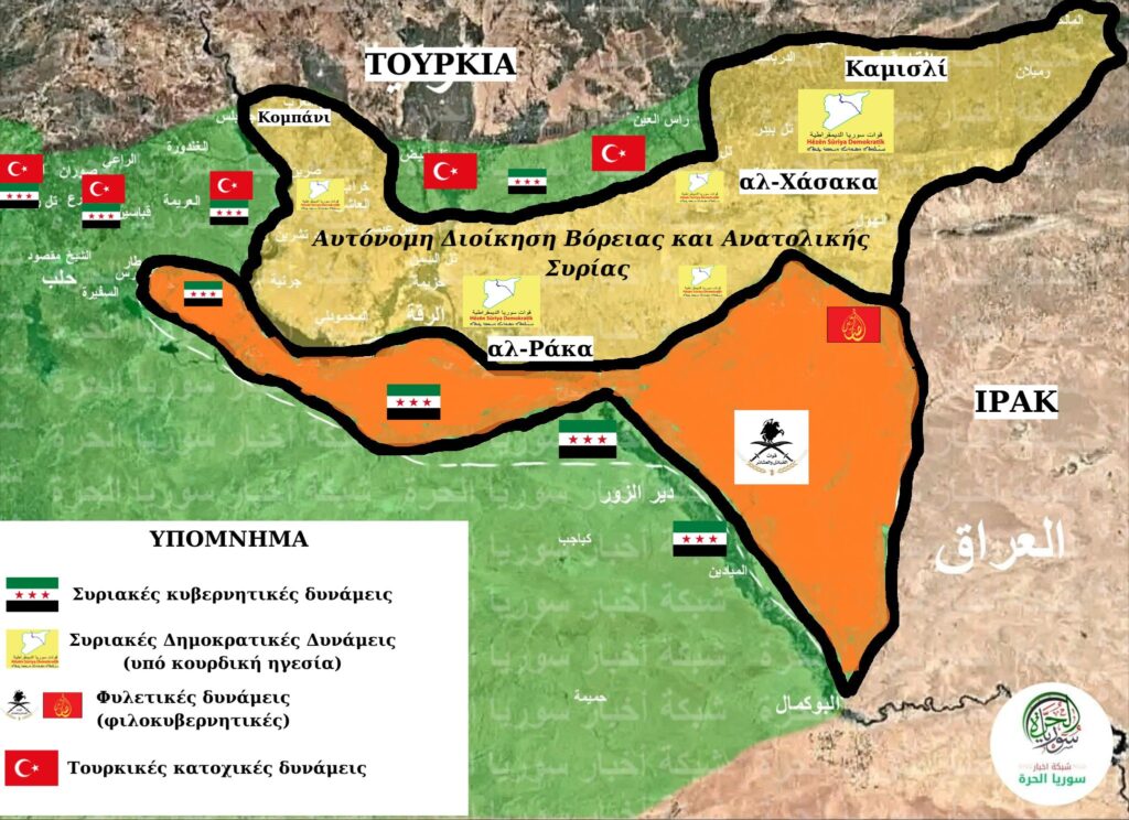 Στη Συρία, η υπό κουρδικό έλεγχο Αυτόνομη Διοίκηση Βόρειας και Ανατολικής Συρίας (γνωστή και ως Ροζάβα) καταρρέει. Οι υπό κουρδικό έλεγχο Συριακές Δημοκρατικές Δυνάμεις (SDF) έχασαν, μέσα σε σχεδόν τρεις ημέρες, τα εδάφη που απεικονίζονται με πορτοκαλί χρώμα στον παρατιθέμενο χάρτη. Τα εδάφη αυτά κατέλαβαν κυβερνητικές δυνάμεις, σε πολλές περιπτώσεις με την αεροπορική υποστήριξη της Τουρκίας, καθώς και φιλοκυβερνητικές φυλετικές δυνάμεις.