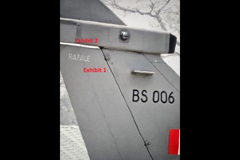 Υπάρχει μια άλλη ασυμφωνία, επίσης με το πηδάλιο. Σε φωτογραφίες γνωστών ινδικών Rafale, μια κάθετη γραμμή ραφής τέμνει την κορυφή του πηδαλίου υπό γωνία. Στο πηδάλιο στο πεδίο, αυτή η κάθετη ραφή φαίνεται να τέμνει την κορυφή του πηδαλίου υπό ορθή γωνία.