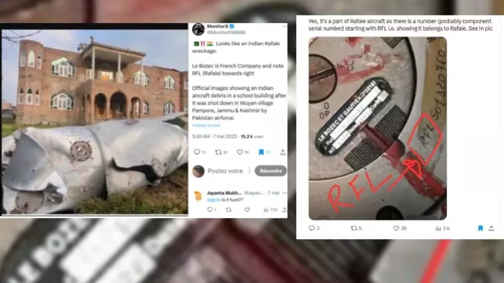 Πακιστανοί χρήστες του διαδικτύου ισχυρίζονται ότι τα συντρίμμια του Rafale βρέθηκαν στις 7 Μαΐου 2025 στο Wuyan του Κασμίρ. Ωστόσο, η εικόνα δείχνει μια εξωτερική δεξαμενή καυσίμου, πιθανώς από αεροσκάφος Mirage 2000, και δεν υπάρχει καμία ένδειξη ότι προήλθε από καταρριφθέν αεροπλάνο. © X
