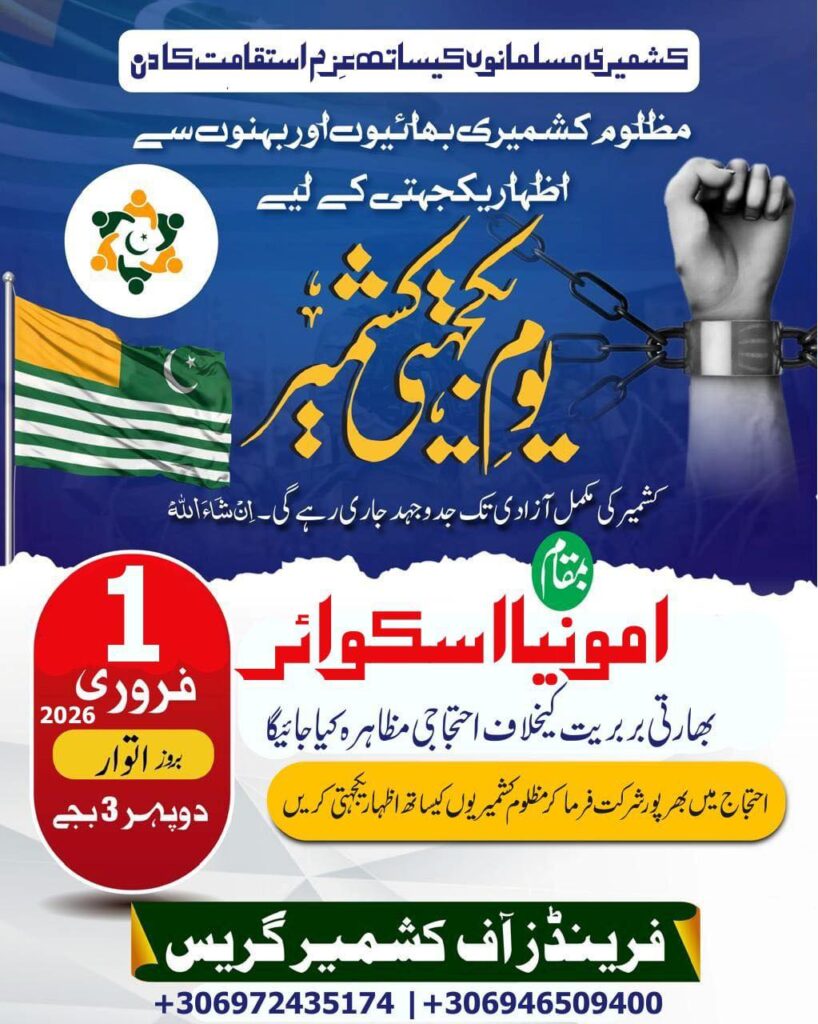 ”Οι προετοιμασίες για την Ημέρα Αλληλεγγύης με το Κασμίρ στην Ελλάδα ολοκληρώθηκαν με επιτυχία, καθώς η πακιστανική και η κασμιριανή κοινότητα ετοιμάζονται να εκφράσουν την ακλόνητη υποστήριξή τους στον λαό του κατεχόμενου από την Ινδία Κασμίρ. Στο πλαίσιο αυτό, οι Φίλοι του Κασμίρ Ελλάδας διοργάνωσαν μια σημαντική συνέντευξη Τύπου στην οποία περιγράφονταν οι προγραμματισμένες δραστηριότητες και εκδηλώσεις διαμαρτυρίας. Οι ηγέτες της κοινότητας τόνισαν την ευαισθητοποίηση του κοινού σε διεθνές επίπεδο σχετικά με τις παραβιάσεις των ανθρωπίνων δικαιωμάτων στο Κασμίρ και επιβεβαίωσαν την αλληλεγγύη τους με τον αγώνα του Κασμίρ για αυτοδιάθεση. Αναμένεται ισχυρή προσέλευση και ειρηνικές διαδηλώσεις την Ημέρα Αλληλεγγύης με το Κασμίρ.”