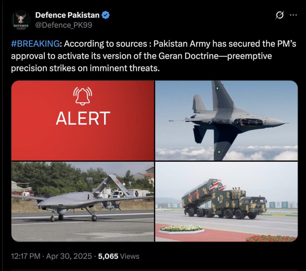 Πηγές που συνδέονται με τον πακιστανικό στρατό ισχυρίζονται ότι το Πακιστάν ενεργοποίησε το στρατιωτικό «Δόγμα Γεράν», η οποία επικεντρώνεται σε προληπτικά πλήγματα ακριβείας, έχει εγκριθεί από τον πρωθυπουργό και έχει σχεδιαστεί για να εξουδετερώνει τις απειλές πριν κλιμακωθούν.