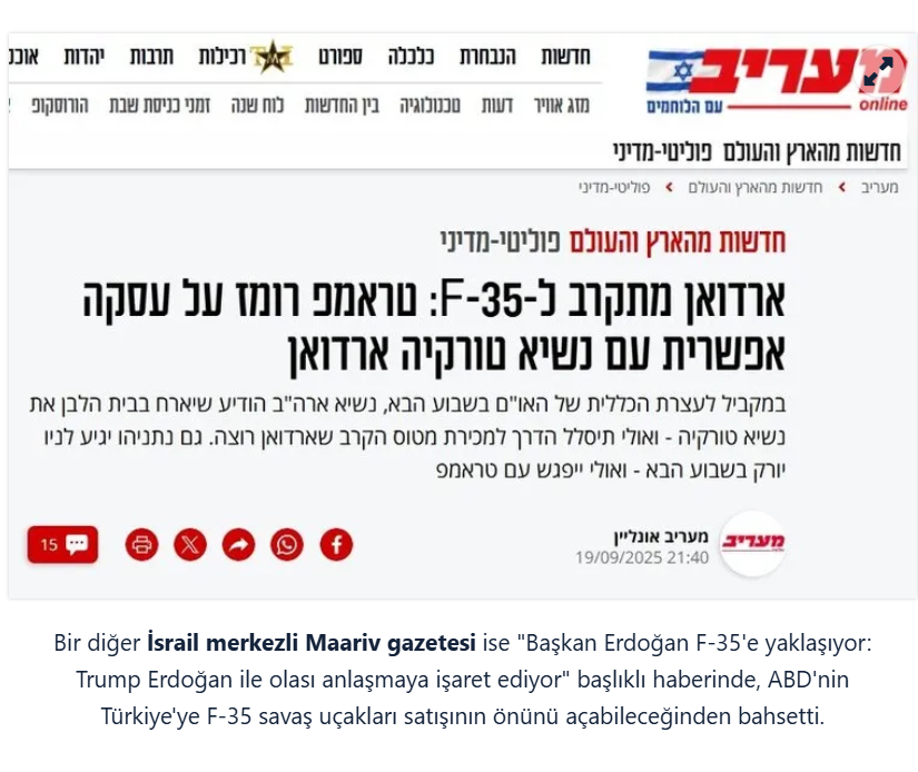 Μια άλλη ισραηλινή εφημερίδα, η Maariv, ανέφερε σε δημοσίευμά της με τίτλο «Ο Πρόεδρος Ερντογάν πλησιάζει τα F-35: Ο Τραμπ υπαινίσσεται μια πιθανή συμφωνία με τον Ερντογάν» ότι οι ΗΠΑ θα μπορούσαν να ανοίξουν το δρόμο για την πώληση μαχητικών αεροσκαφών F-35 στην Τουρκία.