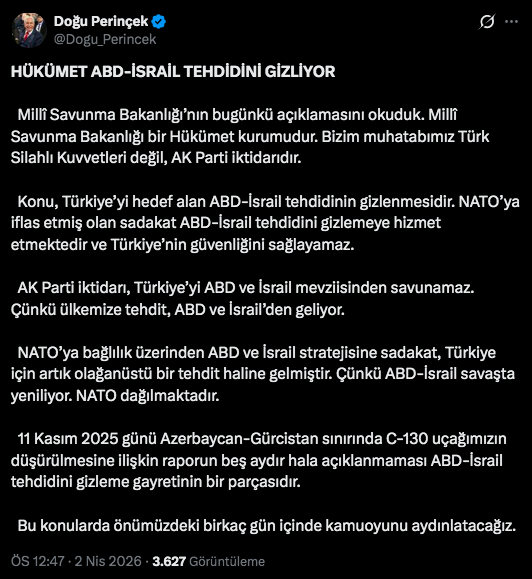 Το ζήτημα είναι η απόκρυψη της αμερικανο-ισραηλινής απειλής που στοχεύει την Τουρκία. Η πίστη στο ΝΑΤΟ, η οποία έχει αποτύχει, χρησιμεύει για να συγκαλύψει την αμερικανο-ισραηλινή απειλή και δεν μπορεί να διασφαλίσει την ασφάλεια της Τουρκίας.