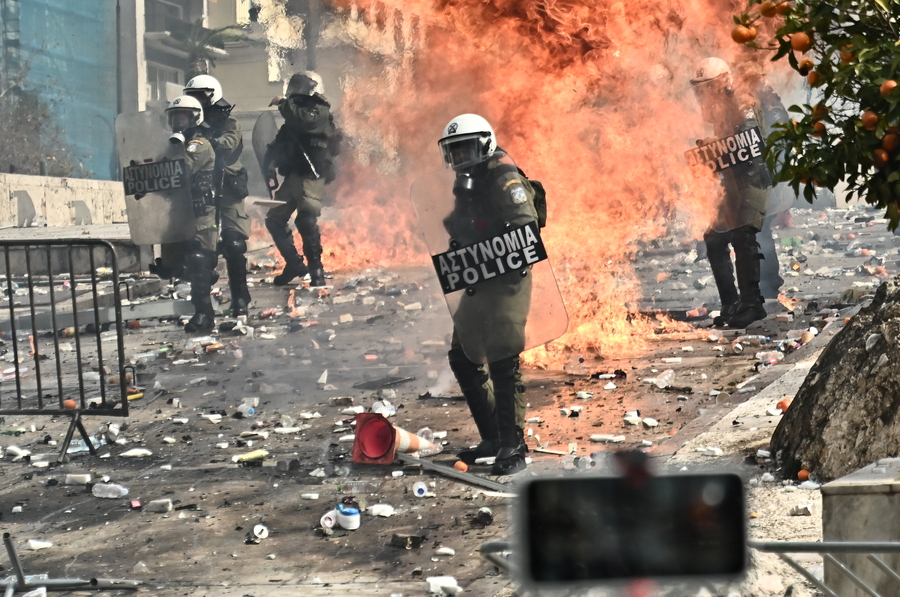 Χάος επικράτησε στο Σύνταγμα με το ξέσπασμα των επεισοδίων μετά την ολοκλήρωση των ομιλιών στη μεγαλειώδη συγκέντρωση για τα δύο χρόνια από την τραγωδία των Τεμπών.