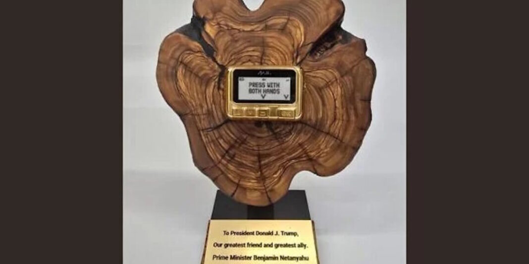 Ειδικότερα, ο Νετανιάχου δώρισε στον Τραμπ έναν χρυσό βομβητή ίδιου τύπου με αυτούς που χρησιμοποιήθηκαν στην τεράστια επιχείρηση κατά της Χεζμπολάχ στις 17 και 18 Σεπτεμβρίου 2024, που είχε ως αποτέλεσμα να σκοτωθούν τουλάχιστον 42 άτομα και να τραυματιστούν χιλιάδες ακόμα, από την συγχρονισμένη έκρηξη βομβητών.