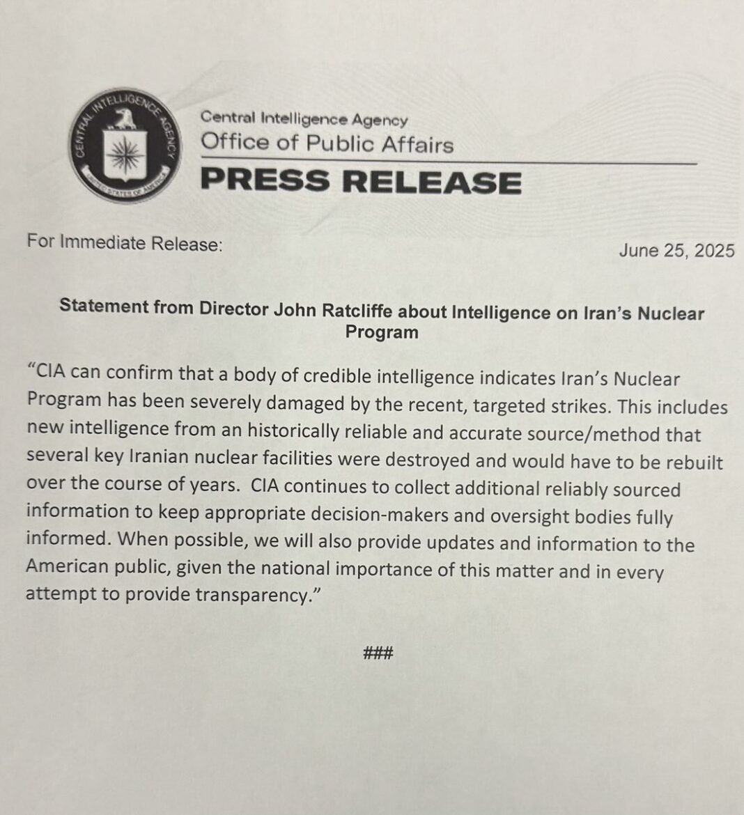 «Η CIA μπορεί να επιβεβαιώσει ότι ένα σύνολο αξιόπιστων πληροφοριών δείχνει ότι το πυρηνικό πρόγραμμα του Ιράν έχει υποστεί σοβαρές ζημιές από τα πρόσφατα, στοχευμένα πλήγματα. Αυτό περιλαμβάνει νέες πληροφορίες από μια ιστορικά αξιόπιστη και ακριβή πηγή/μέθοδο, σύμφωνα με τις οποίες καταστράφηκαν αρκετές βασικές πυρηνικές εγκαταστάσεις του Ιράν και θα πρέπει να ξαναχτιστούν σε βάθος ετών. Η CIA συνεχίζει να συλλέγει πρόσθετες πληροφορίες αξιόπιστης πηγής για να ενημερώνει πλήρως τους αρμόδιους φορείς λήψης αποφάσεων και τα εποπτικά όργανα. Όταν είναι δυνατόν, θα παρέχουμε επίσης ενημερώσεις και πληροφορίες στο αμερικανικό κοινό, δεδομένης της εθνικής σημασίας του θέματος αυτού και σε κάθε προσπάθεια για την παροχή διαφάνειας» .
