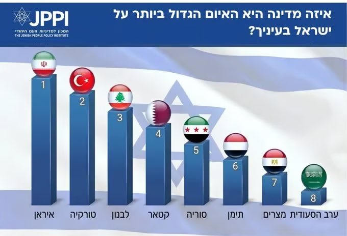 Μια πρόσφατη έρευνα του Ινστιτούτου Πολιτικής του Εβραϊκού Λαού αποκαλύπτει ότι οι Ισραηλινοί θεωρούν πλέον την Τουρκία ως τη δεύτερη σημαντικότερη απειλή τους, μόνο μετά το Ιράν.