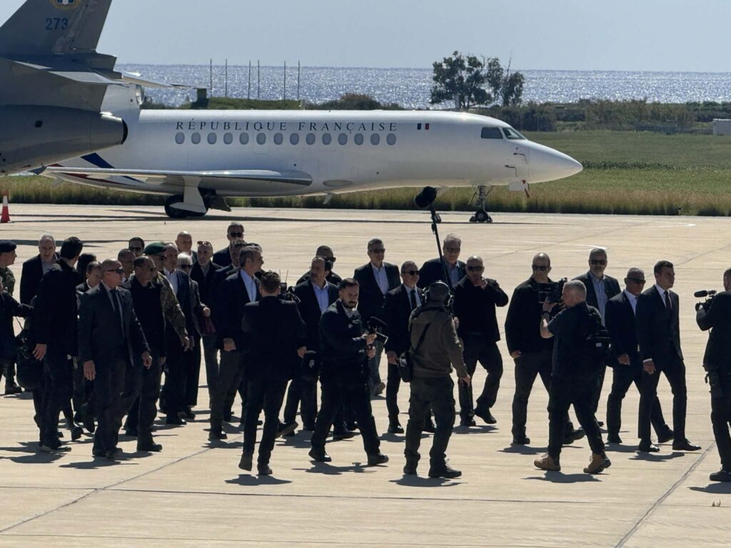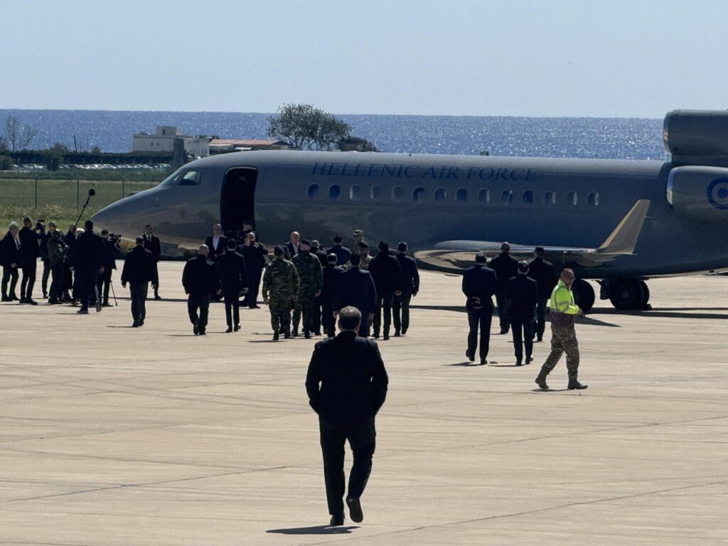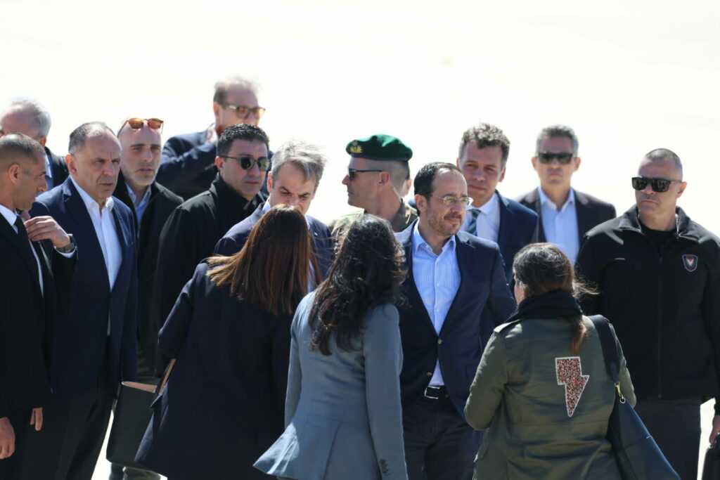 Στην αεροπορική βάση Ανδρέας Παπανδρέου έφτασε λίγο πριν τη 1:00 ο Έλληνας Πρωθυπουργός Κυριάκος Μητσοτάκης και ο Γάλλος Πρόεδρος Εμανουέλ Μακρόν. Τον έλληνα Πρωθυπουργό ανέμενε ο Πρόεδρος της Δημοκρατίας, ο οποίος τον υποδέχθηκε στο σημείο όπου στάθμευσε το C-130. Οι δύο άντρες είχαν ένα εγκάρδιο χαιρετισμό και μια σύντομη συζήτηση, πριν κατευθυνθούν στο σημείο όπου υποδέχθηκαν, λίγο αργότερα, και τον Πρόεδρο της Γαλλίας. Θα ακολουθήσει τριμερής συνάντηση των ηγετών και αμέσως μετά θα προβούν σε δηλώσεις. Στη συνέχεια θα κατευθυνθούν στην φρεγάτα Κίμων.