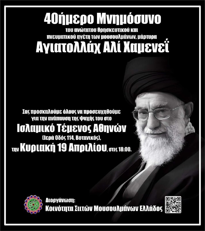 Την Κυριακή στις 19.4.2026 στο Ισλαμικό Τέμενος Αθηνών στον Βοτανικό τελέσθηκε από την Σηιτική Κοινότητα 40ήμερο Μνημόσυνο για το Μαρτύριο του Μακαριστού Ανωτάτου Πνευματικού Ηγέτη του Ιράν Σεγιέντ Αλί Χαμενεΐ.