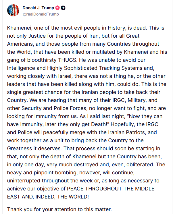 Γράφει στην ανάρτηση: «Ο Χαμενεΐ, ένας από τους πιο διαβολικούς ανθρώπους στην ιστορία, είναι νεκρός. Αυτό δεν είναι μόνο δικαιοσύνη για τον λαό του Ιράν, αλλά και για όλους τους μεγάλους Αμερικανούς και τους ανθρώπους από πολλές χώρες σε όλο τον κόσμο, που έχουν σκοτωθεί ή ακρωτηριαστεί από τον Χαμενεΐ και τη συμμορία του αιμοδιψών ΤΡΑΜΠΟΥΚΩΝ. Δεν μπόρεσε να αποφύγει τις μυστικές υπηρεσίες μας και τα εξαιρετικά εξελιγμένα συστήματα εντοπισμού μας και, σε στενή συνεργασία με το Ισραήλ, δεν υπήρχε τίποτα που να μπορούσε να κάνει αυτός ή οι άλλοι ηγέτες που σκοτώθηκαν μαζί του.