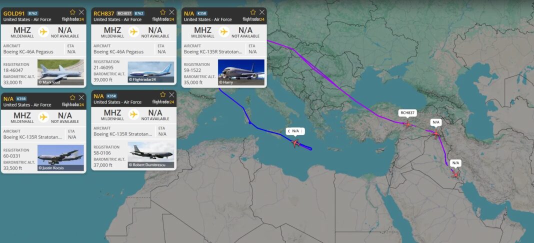 Πολλά αεροσκάφη εναέριου ανεφοδιασμού της Πολεμικής Αεροπορίας των ΗΠΑ KC-135R και KC-46A «Pegasus» αναχώρησαν νωρίτερα σήμερα από το RAF Mildenhall με κατεύθυνση τη Μέση Ανατολή, πιθανότατα ρυμουλκώντας μαχητικά ή/και αεροσκάφη κρούσης, καθώς η στρατιωτική συσσώρευση στην περιοχή κατά του Ιράν συνεχίζεται.
