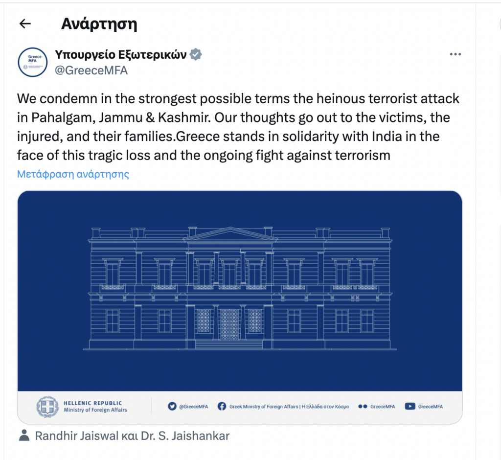 Καταδικάζουμε με τον πιο έντονο τρόπο την αποτρόπαια τρομοκρατική επίθεση στο Pahalgam, το Jammu & Kashmir. Οι σκέψεις μας είναι προς τα θύματα, τους τραυματίες και τις οικογένειές τους. Η Ελλάδα στέκεται αλληλέγγυα με την Ινδία μπροστά σε αυτήν την τραγική απώλεια και στον συνεχιζόμενο αγώνα κατά της τρομοκρατίας