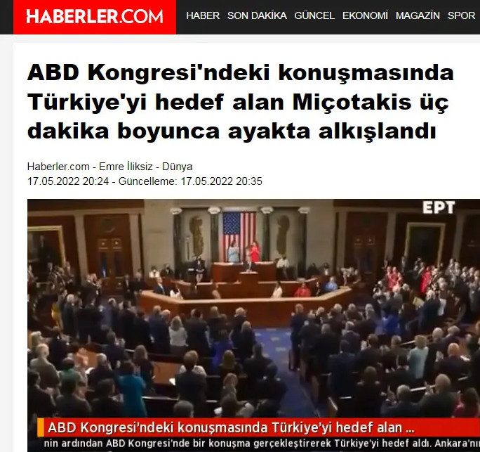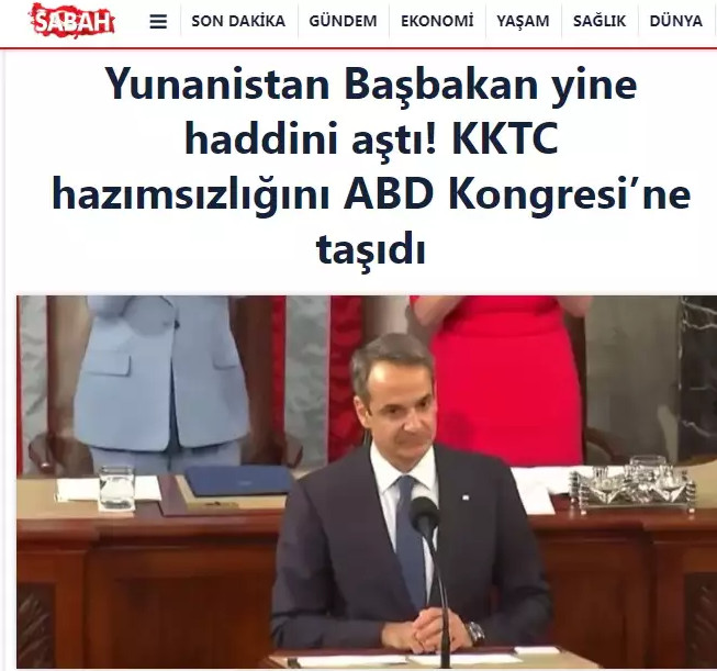 «O Έλληνας πρωθυπουργός Κυριάκος Μητσοτάκης μίλησε στο Κογκρέσο των ΗΠΑ. O Μητσοτάκης , που αγνόησε ανοιχτά την παρουσία της Τουρκίας στην περιοχή, χαρακτήρισε «απαράδεκτη» την λύση δύο κρατών στην Κύπρο καταχειροκροτούμενος από τα μέλη του κογκρέσου» έγραφε η Yeni Safak.