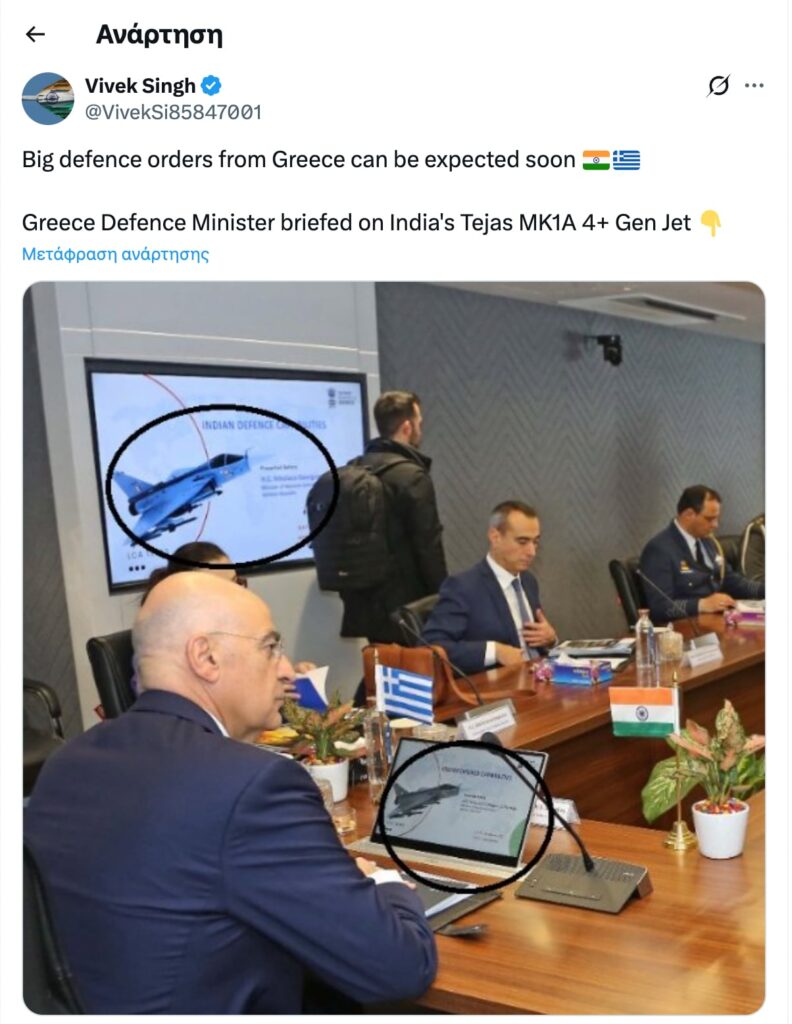 Ο Υπουργός Άμυνας της Ελλάδας ενημερώθηκε για το ινδικό Tejas MK1A 4+.”