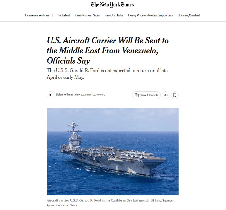 Το Αμερικανικό Πολεμικό Ναυτικό αναπτύσσει περαιτέρω τη στρατιωτική της παρουσία στη Μέση Ανατολή καθώς ο Ντόναλντ Τραμπ εξετάζει πιθανή στρατιωτική δράση έναντι του Ιράν λόγω της συνεχιζόμενης έντασης για το πυρηνικό του πρόγραμμα και άλλες διαφωνίες. Στο πλαίσιο αυτό, έχει δοθεί εντολή στο αεροπλανοφόρο USS Gerald R. Ford, το μεγαλύτερο στο αμερικανικό ναυτικό, να αναχωρήσει από την Καραϊβική Θάλασσα και να κατευθυνθεί προς τη Μέση Ανατολή, σύμφωνα με Αμερικανούς αξιωματούχους που μίλησαν στους New York Times .