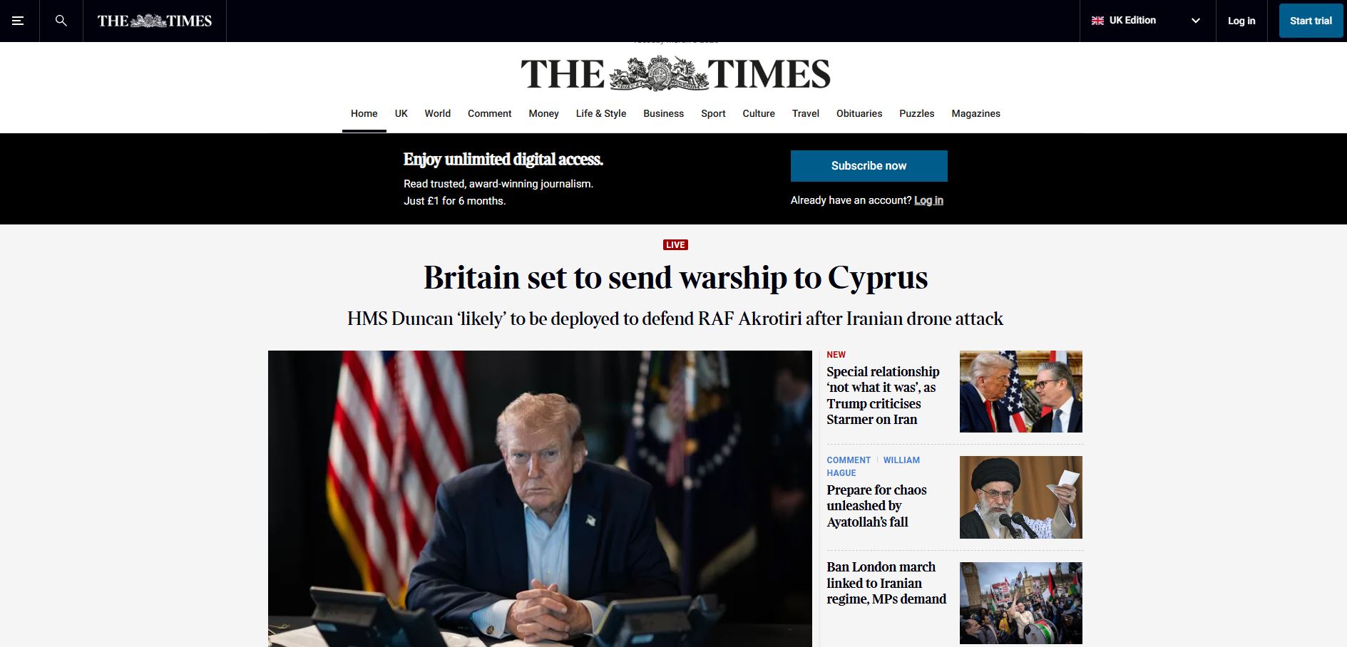 Τον γύρο του διαδικτύου κάνει δημοσίευμα της ηλεκτρονικής εφημερίδας «The Times» ότι η Μεγάλη Βρετανία αποστέλνει σε κυπριακά νερά το αντιτορπιλικό πολεμικό σκάφος «HMS Duncan», στο πλαίσιο αυξημένων μέτρων ασφαλείας στις Βρετανικές Βάσεις μετά το «χτύπημα» ιρανικού drone στο Ακρωτήρι.