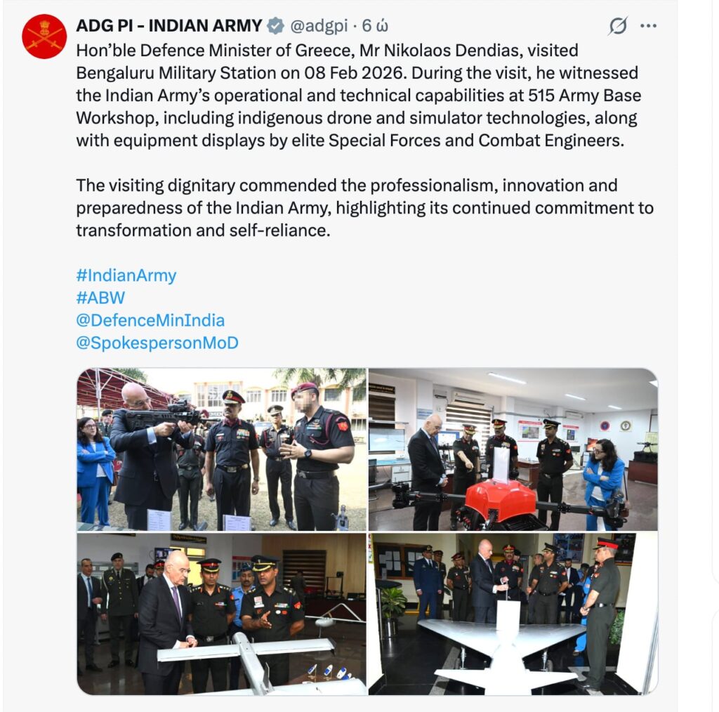 ”Ο αξιότιμος Υπουργός Άμυνας της Ελλάδας, κ. Νικόλαος Δένδιας, επισκέφθηκε τη Στρατιωτική Βάση της Μπανγκαλόρ στις 8 Φεβρουαρίου 2026. Κατά τη διάρκεια της επίσκεψης, παρακολούθησε τις επιχειρησιακές και τεχνικές δυνατότητες του Ινδικού Στρατού στο Εργαστήριο της 515ης Στρατιωτικής Βάσης, συμπεριλαμβανομένων των εγχώριων τεχνολογιών drone και προσομοιωτών, καθώς και επιδείξεις εξοπλισμού από επίλεκτες Ειδικές Δυνάμεις και Μηχανικούς Μάχης.