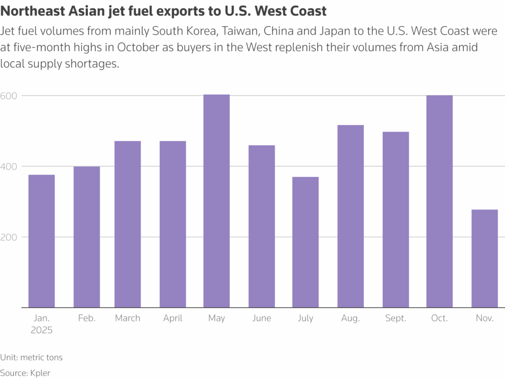Τον περασμένο μήνα, οι εξαγωγές καυσίμων αεριωθούμενων από τη Βορειοανατολική Ασία προς τη Δυτική Ακτή των ΗΠΑ ήταν σε υψηλά πέντε μηνών, περίπου 600.000 τόνων, σύμφωνα με στοιχεία παρακολούθησης πλοίων της Kpler.