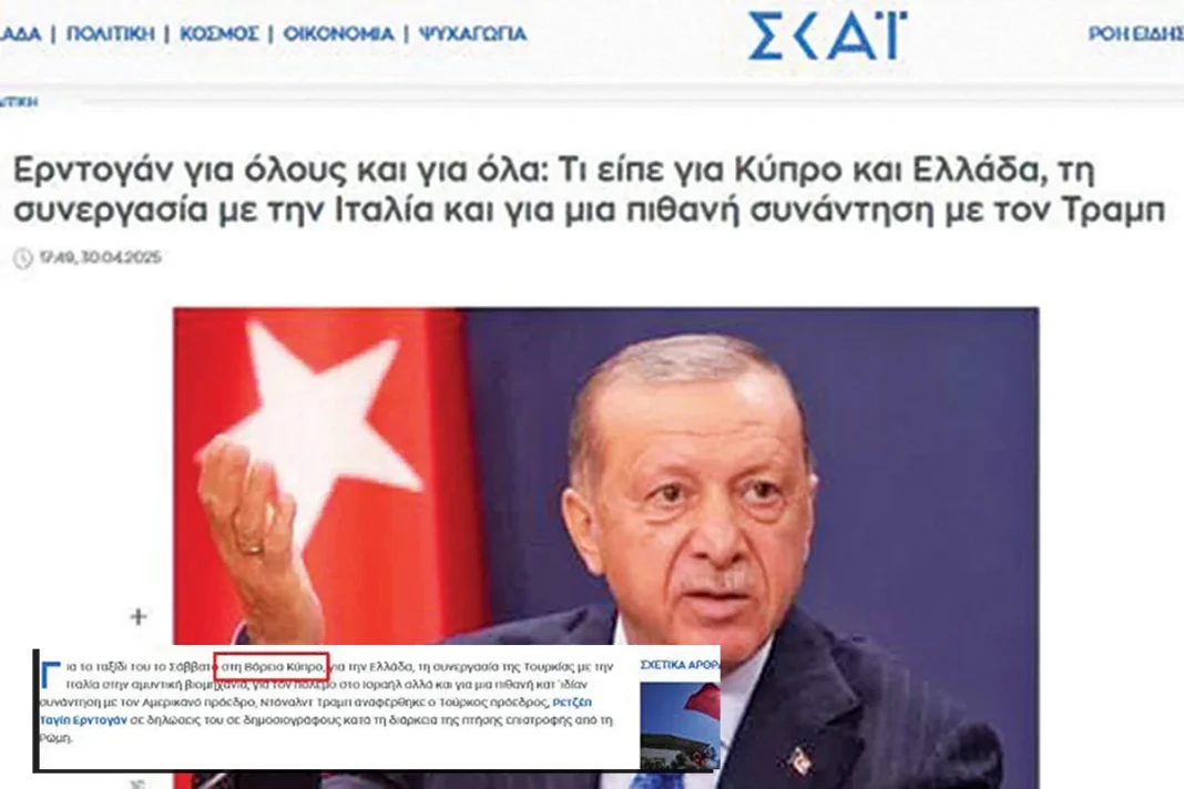 Σε άρθρο, λοιπόν, για τις δηλώσεις που έκανε ο Ερντογάν, επιστρέφοντας από τη Ρώμη στην Αγκυρα, η ιστοσελίδα του Σκάι, αντί να κάνει αναφορά σε ψευδοκράτος ή Κατεχόμενα, μοστράρει το «Βόρεια Κύπρος» σαν να μη συμβαίνει τίποτα. Σαν να μην υπάρχει κατοχή κυπριακού εδάφους εδώ και πάνω από 50 χρόνια. Σαν να μην είναι ψευδοκράτος το μόρφωμα που επιβιώνει χάρη στην κατοχική τουρκική δύναμη. Πόση ντροπή πια…