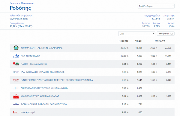 Πιο συγκεκριμένα στην περιφέρεια της Ροδόπης τα αποτελέσματα στο 92,05% της ενσωμάτωσης το ΚΙΕΦ κατέγραφε ποσοστό 36,87% με 13.206 ψήφους έναντι 38,00% και 23.063 ψήφων το 2019. Και η ΝΔ 19,61% με 7.025 ψήφους έναντι 19,69% και 11.947 ψήφων το 2019.