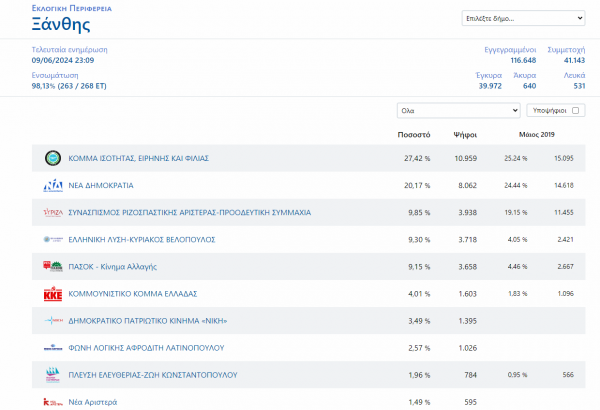 Και στην Ξάνθη με την ενσωμάτωση στο 98,13% το ΚΙΕΦ έφτασε το 27,42% με 10.959 ψήφους, έναντι 25,24% και 15.095 ψήφων το 2019. Την ίδια στιγμή η ΝΔ έλαβε 20,17% με 8.062 ψήφους έναντι 24,44% και 14.618 το 2019.