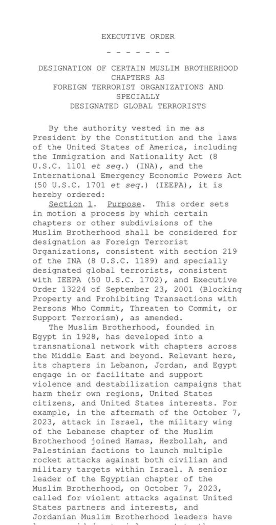 Το προεδρικό διάταγμα που υπέγραψε ο Πρόεδρος των ΗΠΑ Ντόναλντ Τραμπ απόψε (Δευτέρα-Τρίτη), με το οποίο ξεκίνησε τη διαδικασία κήρυξης ορισμένων παρακλαδιών της Μουσουλμανικής Αδελφότητας ως τρομοκρατικής οργάνωσης, θα μπορούσε να έχει σημαντικές επιπτώσεις για ένα από τα πιο ισχυρά και παλαιότερα ισλαμιστικά κινήματα στον κόσμο. Εάν ολοκληρωθεί, η κίνηση αναμένεται να επιβάλει αυστηρούς οικονομικούς περιορισμούς σε ορισμένα παρακλάδια της οργάνωσης και να επηρεάσει επίσης μουσουλμανικές οργανώσεις εντός των Ηνωμένων Πολιτειών.