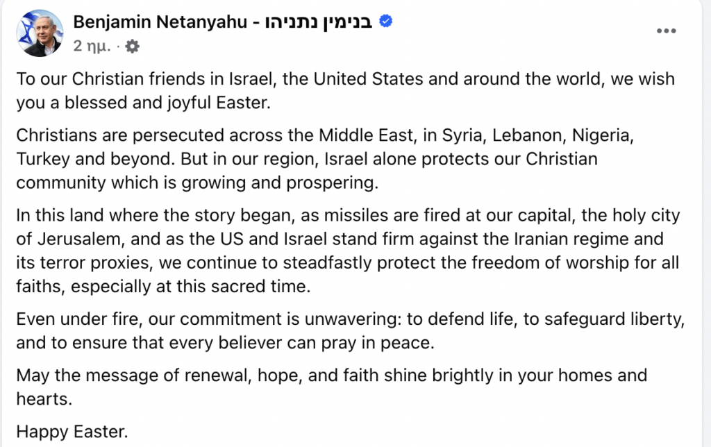 Στους Χριστιανούς φίλους μας στο Ισραήλ, τις Ηνωμένες Πολιτείες και σε όλο τον κόσμο, ευχόμαστε ένα ευλογημένο και χαρούμενο Πάσχα.