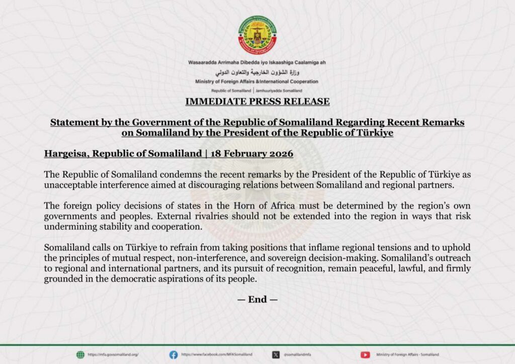 Η Σομαλιλάνδη απαντά επίσημα στα πρόσφατα σχόλια του Προέδρου της Τουρκίας σχετικά με τη Σομαλιλάνδη.