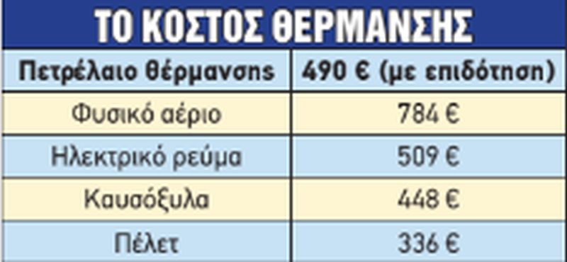 Ωστόσο, σε περίπτωση που ένα νοικοκυριό αποφασίσει να θερμανθεί με ηλεκτρικό ρεύμα (κλιματιστικά ή ηλεκτρικές σόμπες), το κόστος ανέρχεται στα 509 ευρώ. Αντίστοιχα, το κόστος για καυσόξυλα ανέρχεται στα 448 ευρώ και για πέλετ 336 ευρώ (βλέπε πίνακα).
