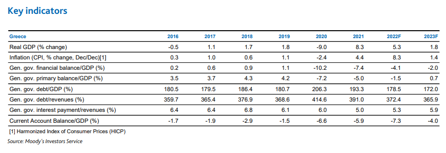Όπως σημειώνει η Moody’s, στις 16 Σεπτεμβρίου επιβεβαίωσε την αξιολόγηση Ba3 της Ελλάδας και διατήρησε το σταθερό outlook. Οι βασικοί παράγοντες ήταν: (i) η ποιότητα του ενεργητικού των τραπεζών, η οποία είχε βελτιωθεί σημαντικά, με τον δείκτη NPEs ωστόσο να παραμένει συγκριτικά υψηλός, (ii) η ισχυρή ανάκαμψη της ανάπτυξης, η οποία ωστόσο επισκιάζεται από τον υψηλό πληθωρισμό και την αναμενόμενη επιβράδυνση και (iii) ο μειούμενος δείκτης χρέους και η ισχυρή προσιτότητά του, στοιχεία ωστόσο τα οποία αντισταθμίζονται από τα πολύ υψηλά επίπεδα χρέους.