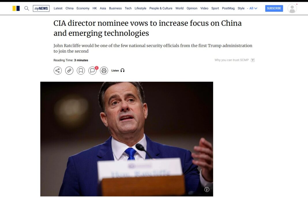 Ο Τζον Ράτκλιφ, υποψήφιος του εκλεγμένου προέδρου των ΗΠΑ Ντόναλντ Τραμπ για διευθυντής της CIA, δεσμεύτηκε την Τετάρτη ότι, εάν εγκριθεί για να ηγηθεί της υπηρεσίας κατασκοπείας, θα εντείνει την εστίασή της στην Κίνα και τις αναδυόμενες τεχνολογίες.