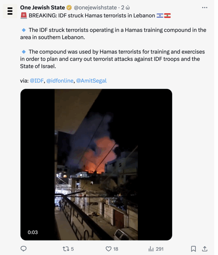 🔹 Οι Ισραηλινές Ένοπλες Δυνάμεις χτύπησαν τρομοκράτες που δρούσαν σε κέντρο εκπαίδευσης της Χαμάς στην περιοχή στο νότιο Λίβανο.