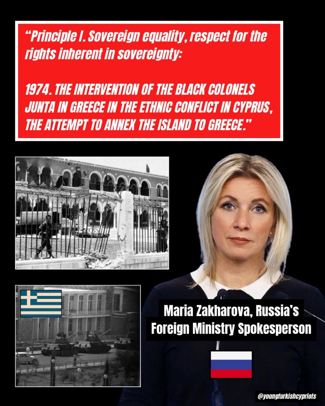 Η Ζαχάροβα υποστήριξε ότι η Ελλάδα ήταν αυτή που παραβίασε το διεθνές δίκαιο το 1974, όταν η ελληνική χούντα εξαπέλυσε πραξικόπημα στην Κύπρο για να ενώσει το νησί με την Ελλάδα – ένα γεγονός που οδήγησε σε πόλεμο και διχασμό.