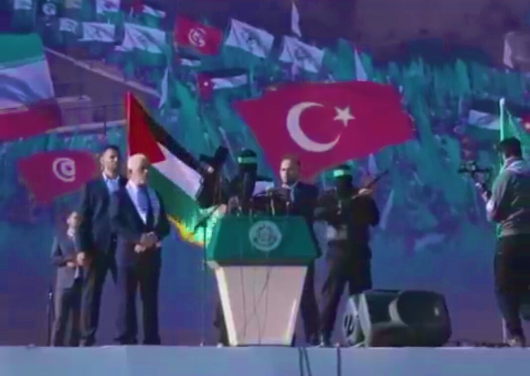Ο Yahya Sinwar, επιδεικνύοντας το όπλο του Υπολοχαγού Hadar Goldin, κάτω από μια τεράστια τουρκική σημαία.