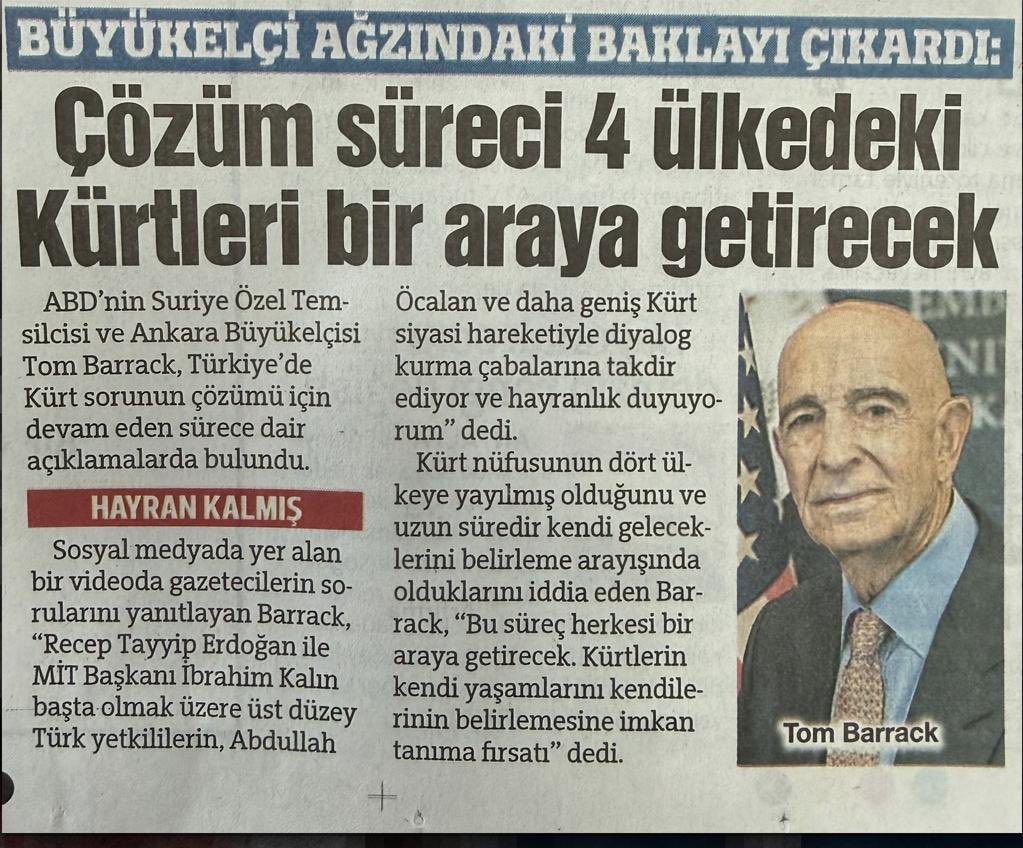 ”Ο Πρέσβης των ΗΠΑ στην Άγκυρα και Ειδικός Απεσταλμένος για τη Συρία, Τομ Μπαράκ, έκανε για άλλη μια φορά σκανδαλώδεις δηλώσεις. Σχετικά με τη διαδικασία «Τουρκία Χωρίς Τρομοκρατία», ο Μπαράκ δήλωσε ότι είναι «μια ευκαιρία να ενωθούν οι Κούρδοι από τις τέσσερις μεγάλες χώρες».