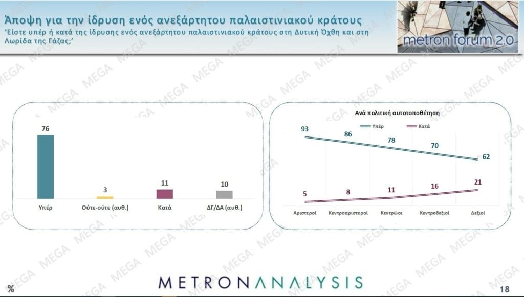 Δημοσκόπηση της Metron Analysis, η οποία παρουσιάστηκε το βράδυ της Πέμπτης στο MEGA, κατέδειξε πως σχεδον 8 στους 10 Έλληνες τάσσονται υπέρ της ίδρυσης παλαιστινιακού κράτους.