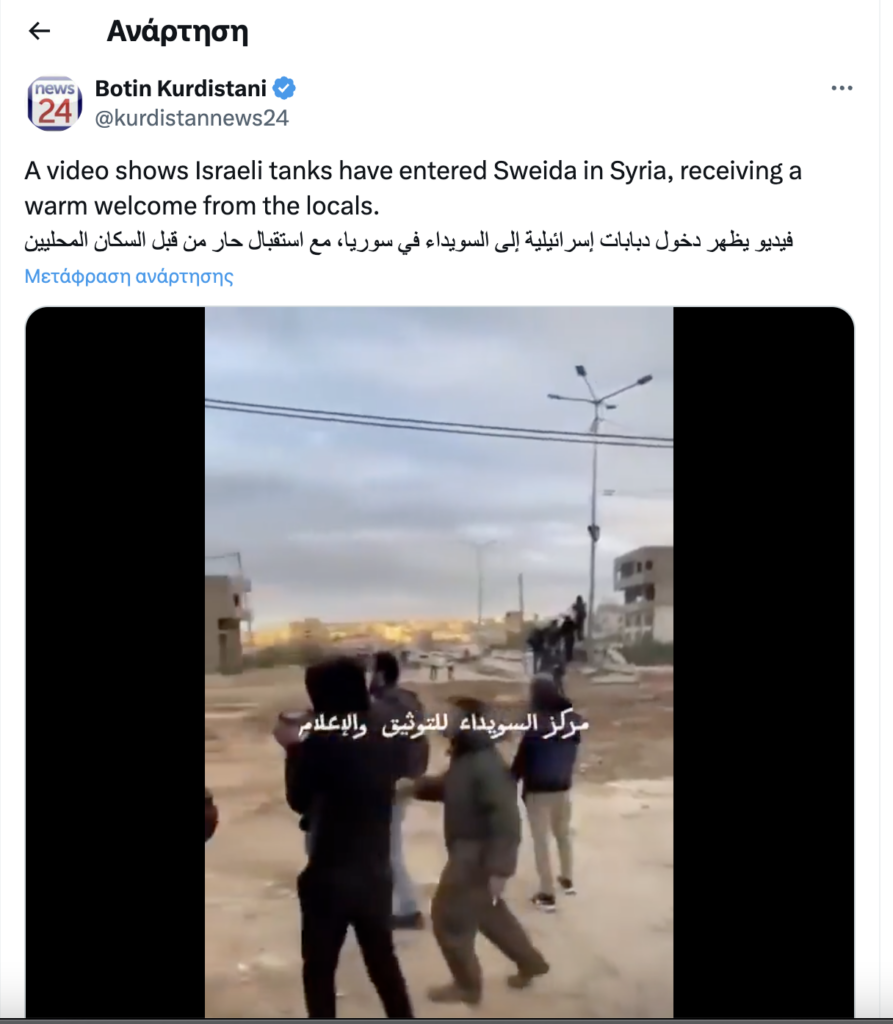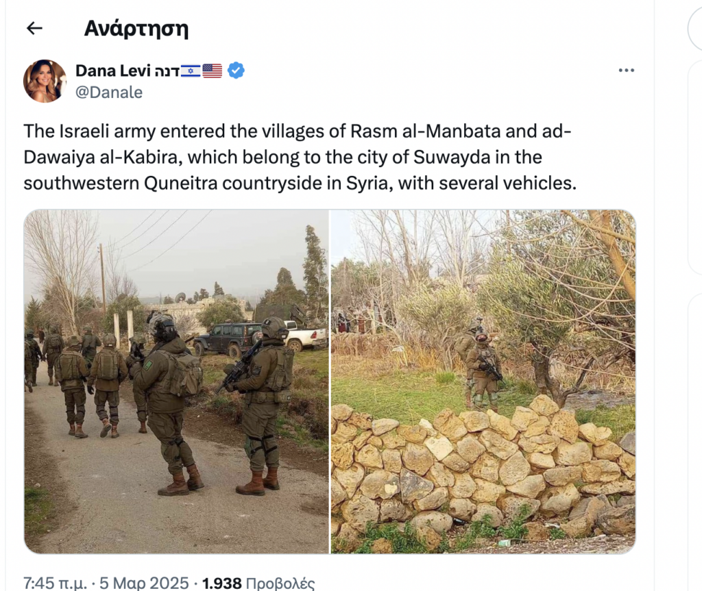 Σήμερα το πρωί ο ισραηλινός στρατός εισήλθε και κατέλαβε δύο ακόμη περιοχές, τα χωριά Ρασμ αλ-Μανμπάτα και αντ-Νταουάγια αλ-Καμπίρα, που ανήκουν στην πόλη Σουγουέιντα στη νοτιοδυτική περιοχή της Κουνέιτρα στη Συρία, με πολλά οχήματα.