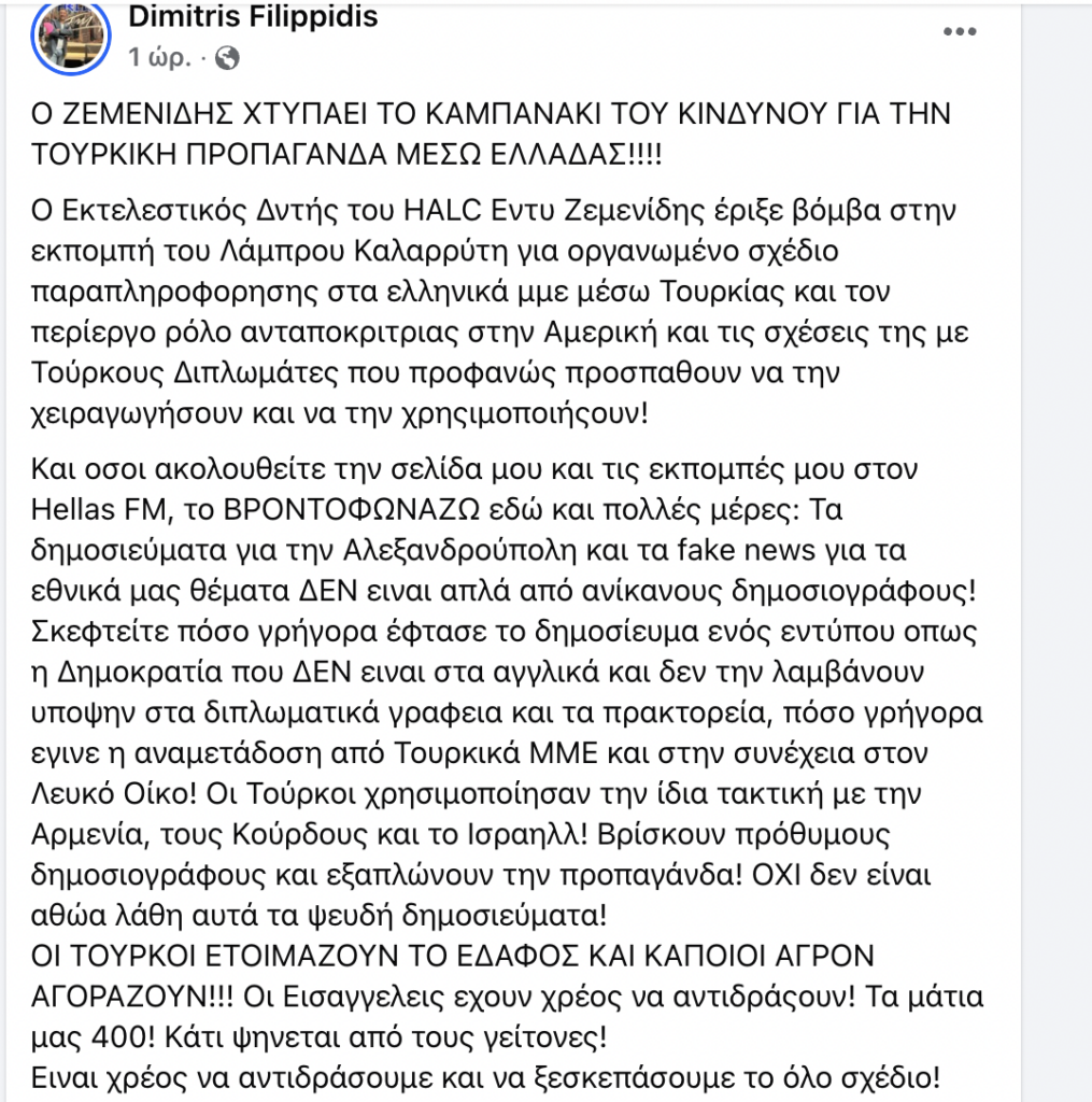 Και οσοι ακολουθείτε την σελίδα μου και τις εκπομπές μου στον Hellas FM, το ΒΡΟΝΤΟΦΩΝΑΖΩ εδώ και πολλές μέρες: Τα δημοσιεύματα για την Αλεξανδρούπολη και τα fake news για τα εθνικά μας θέματα ΔΕΝ ειναι απλά από ανίκανους δημοσιογράφους! Σκεφτείτε πόσο γρήγορα έφτασε το δημοσίευμα ενός εντύπου οπως η Δημοκρατία που ΔΕΝ ειναι στα αγγλικά και δεν την λαμβάνουν υποψην στα διπλωματικά γραφεια και τα πρακτορεία, πόσο γρήγορα εγινε η αναμετάδοση από Τουρκικά ΜΜΕ και στην συνέχεια στον Λευκό Οίκο! Οι Τούρκοι χρησιμοποίησαν την ίδια τακτική με την Αρμενία, τους Κούρδους και το Ισραηλλ! Βρίσκουν πρόθυμους δημοσιογράφους και εξαπλώνουν την προπαγάνδα! ΟΧΙ δεν είναι αθώα λάθη αυτά τα ψευδή δημοσιεύματα!