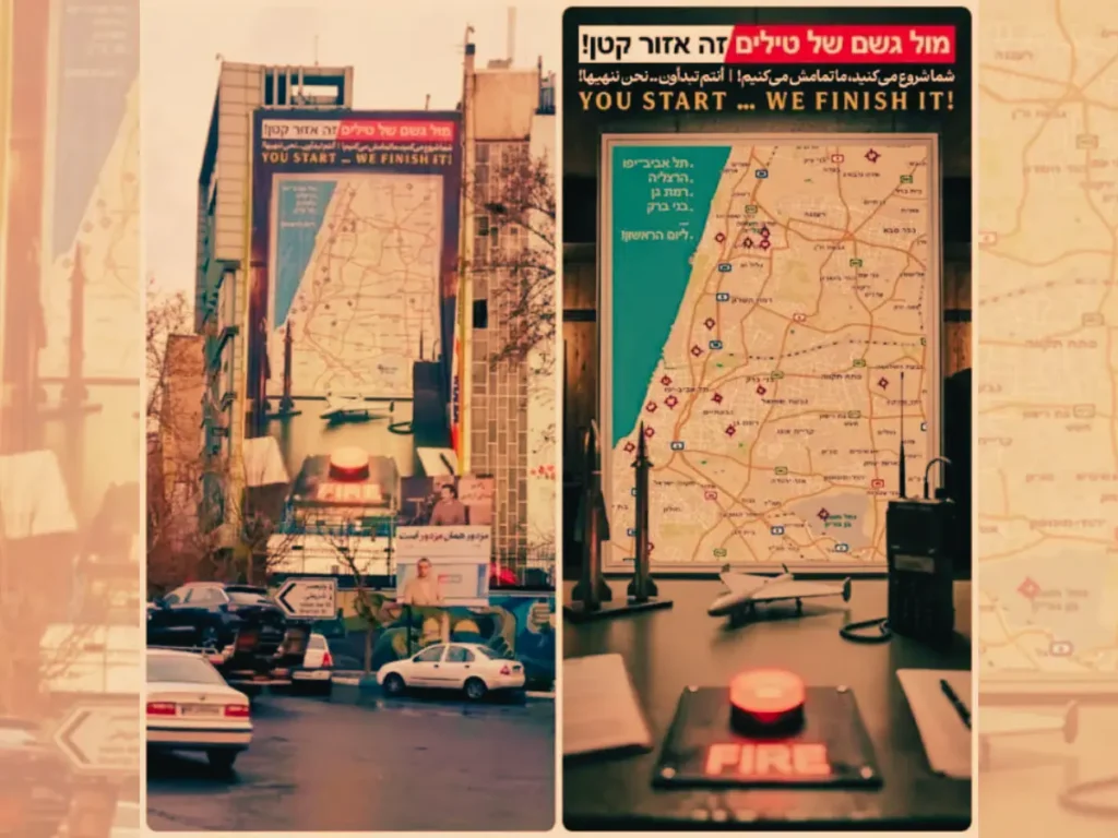 Ο χάρτης δείχνει το κεντρικό Ισραήλ, με επισημασμένους βασικούς στόχους, όπως το αεροδρόμιο Μπεν Γκουριόν, το αρχηγείο της βάσης Kirya του Ισραηλινού Στρατού στο Τελ Αβίβ, τη βάση της Διεύθυνσης Πληροφοριών του Ισραηλινού Στρατού στο Glilot, κοντά στην Herzliya, και άλλες στρατηγικές τοποθεσίες σε όλη την περιοχή. Το πανό δείχνει επίσης ένα στρατιωτικό γραφείο με ένα φωτεινό κόκκινο κουμπί “FIRE”, ένα μαχητικό αεροσκάφος, δύο βαλλιστικούς πυραύλους και έναν ασύρματο, μαζί με πολιτικές σημειώσεις. “Εσείς ξεκινάτε… Εμείς το τελειώνουμε”, γράφει ο τίτλος του πανό στα αγγλικά.