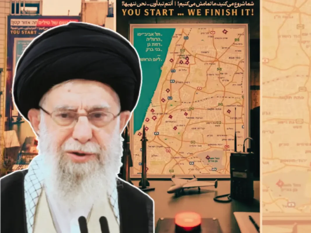 Ο χάρτης δείχνει το κεντρικό Ισραήλ, με επισημασμένους βασικούς στόχους, όπως το αεροδρόμιο Μπεν Γκουριόν, το αρχηγείο της βάσης Kirya του Ισραηλινού Στρατού στο Τελ Αβίβ, τη βάση της Διεύθυνσης Πληροφοριών του Ισραηλινού Στρατού στο Glilot, κοντά στην Herzliya, και άλλες στρατηγικές τοποθεσίες σε όλη την περιοχή. Το πανό δείχνει επίσης ένα στρατιωτικό γραφείο με ένα φωτεινό κόκκινο κουμπί “FIRE”, ένα μαχητικό αεροσκάφος, δύο βαλλιστικούς πυραύλους και έναν ασύρματο, μαζί με πολιτικές σημειώσεις. “Εσείς ξεκινάτε… Εμείς το τελειώνουμε”, γράφει ο τίτλος του πανό στα αγγλικά.