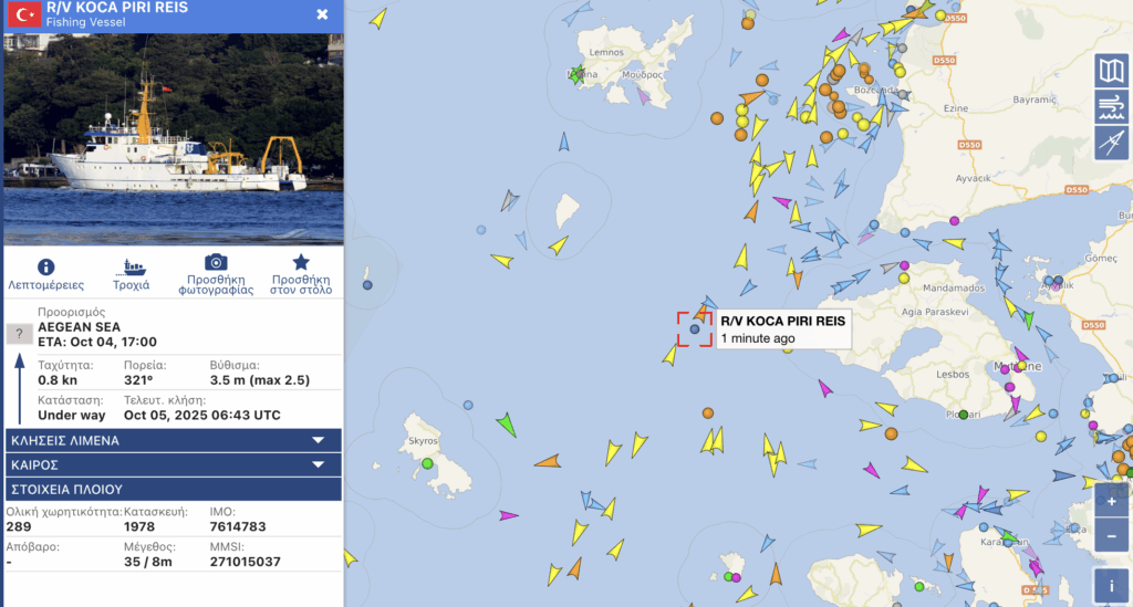 Η Τουρκία κλιμακώνει κατακόρυφα τις προκλήσεις στο Αιγαίο, με το Piri Reis να βρίσκεται εντός ελληνικής δυνητικής υφαλοκρηπίδας, δυτικά της Λήμνου, έχοντας ξεκινήσει έρευνες.
