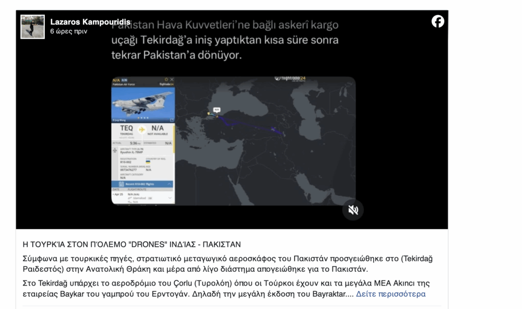 Σύμφωνα με τον αμυντικό αναλυτή, Αντιστράτηγο ε.α. Λάζαρο Καμπουρίδη* , o οποίος επικαλείται τουρκικές πηγές, στρατιωτικό μεταγωγικό αεροσκάφος του Πακιστάν προσγειώθηκε στο (Tekirdağ Ραιδεστός) στην Ανατολική Θράκη και μέρα από λίγο διάστημα απογειώθηκε για το Πακιστάν.