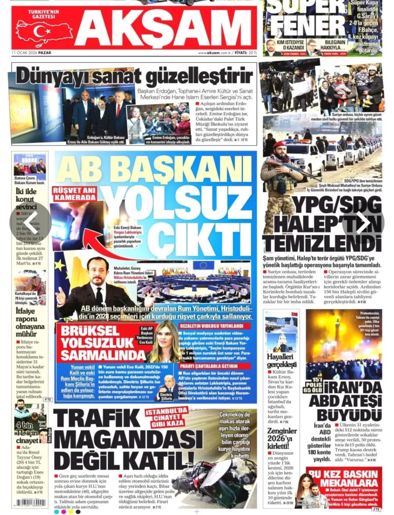 Παράλληλα, στο ίδιο πρωτοσέλιδο προβάλλονται με έντονο τρόπο στρατιωτικές και γεωπολιτικές εξελίξεις στη Συρία, με την Άγκυρα να εμφανίζεται ως παράγοντας «ασφάλειας», καθώς και εικόνες έντασης από το Ιράν, όπου –σύμφωνα με το δημοσίευμα– κλιμακώνονται οι διαδηλώσεις με αμερικανική εμπλοκή.